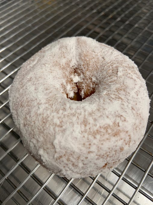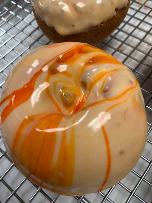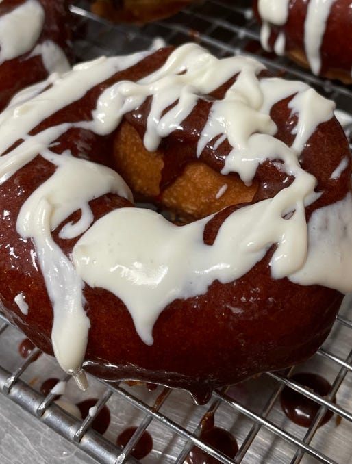 Old fashioned cake donut topped with homemade cinnamon goo glaze & homemade cream cheese icing.