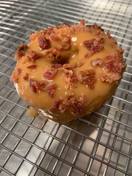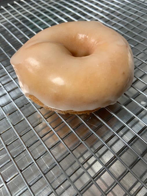 Old fashioned cake donut topped with maple glaze & bacon.