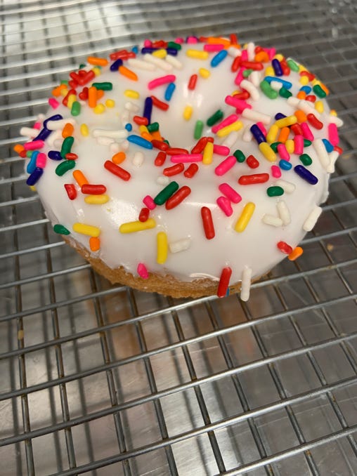 Old fashioned donut topped with vanilla glaze & rainbow sprinkles.