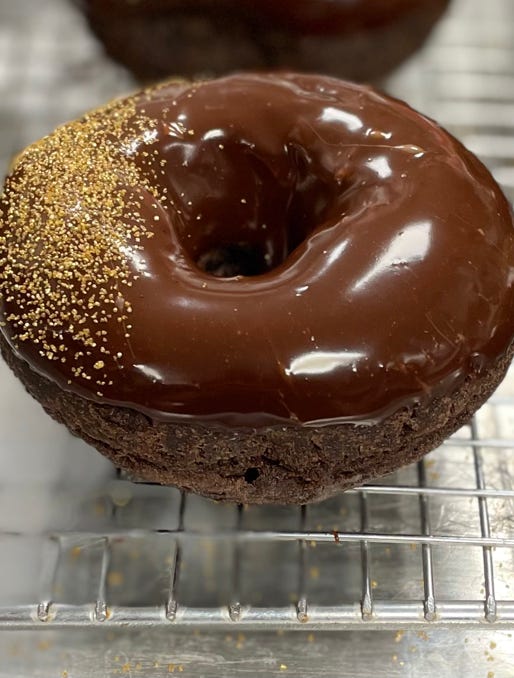 Devils food cake donut topped with dark chocolate mocha glaze and gold sugar crystals