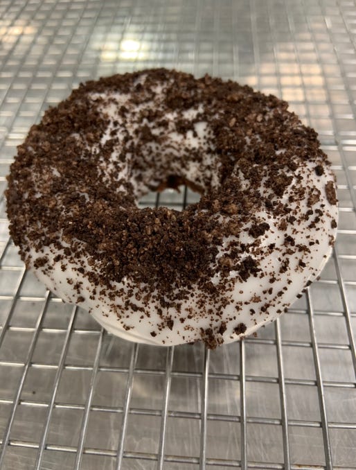 Devil's food cake donut topped with vanilla glaze and crushed oreos.