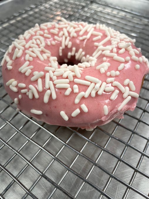 Old fashioned donut topped with strawberry glaze & white sprinkles.