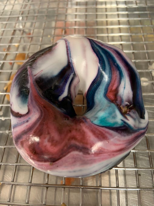 Old fashioned cake donut topped with vanilla tie dye glaze (Colors and Design Vary Daily)