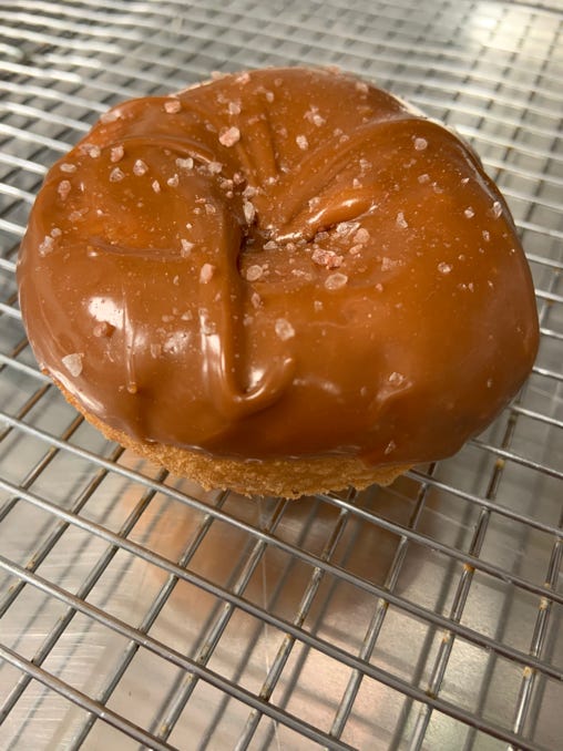 Old fashioned cake donut topped with caramel fudge glaze & pink himalayan sea salt crystals.