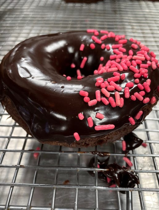 Devil’s food cake donut topped with dark chocolate raspberry glaze drizzled with “80’s hot pink” chocolate