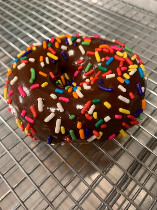 Old fashioned donut topped with chocolate glaze & rainbow sprinkles.