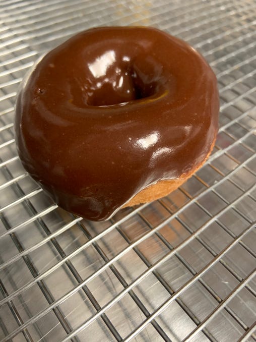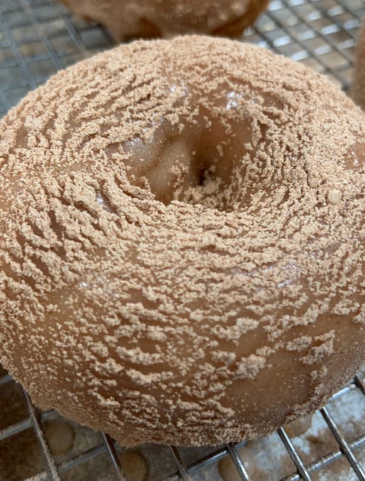 Old fashioned cake donut topped with homemade cinnamon goo glaze & homemade cream cheese icing.